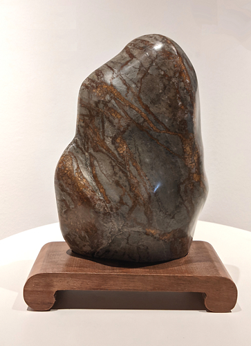 Stein aus der Enns, geschliffen und poliert,Dai aus Massarandubaholz, 2024, Breite: 25 cm, Tiefe: 15 cm, Höhe 36 cm