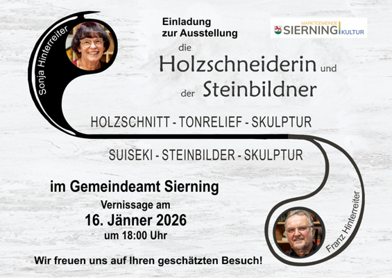 Wir laden alle Kunstfreunde und die, die es noch werden wollen, recht herzlich ein zur Vernissage unserer Ausstellung im Gemeindeamt Sierning am 16. Jänner 2026 um 18:00 Uhr. Wir freuen uns über Ihren geschätzten Besuch. |