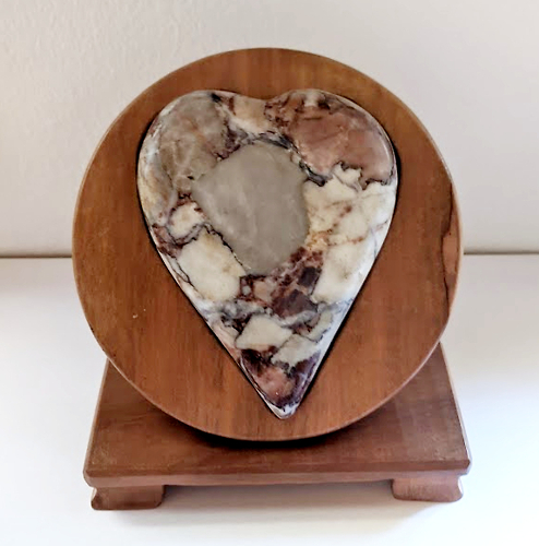 Konglomerat aus Tirol, gekauft 2025 in Wien, geschliffen und poliert, Dai aus Birnenholz, natur, lackiert, Scheibendurchmesser 15 cm.Neue Besitzerin: Anna Hinterreiter