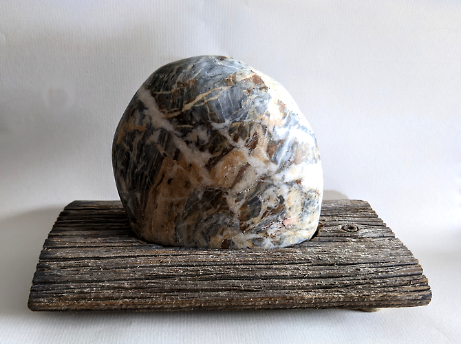 Stein gefunden 2024 in der Steyr, geschliffen und poliert,Dai aus FichtenaltholzBreite: 21 cm, Tiefe: 12 cm, Höhe: 13 cm